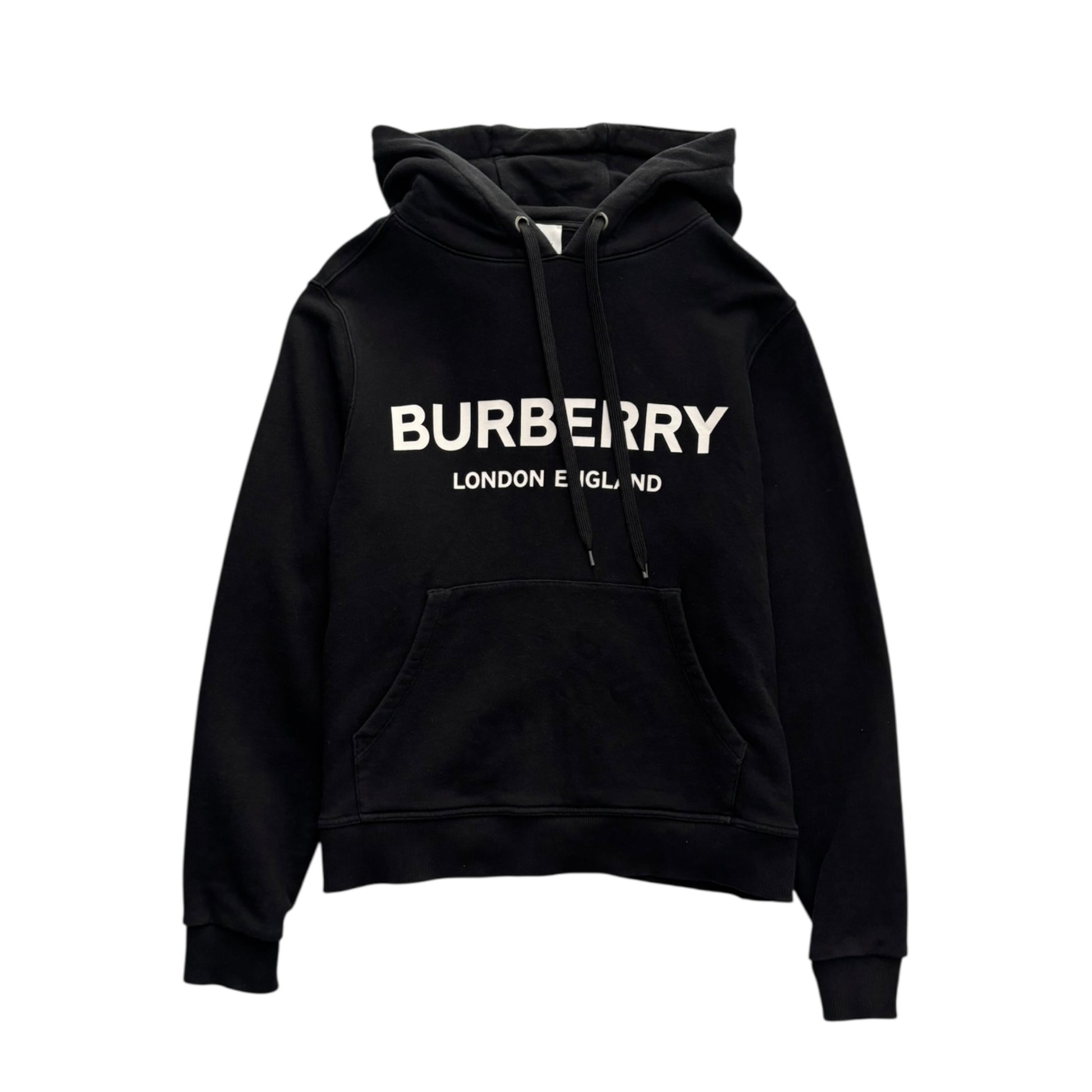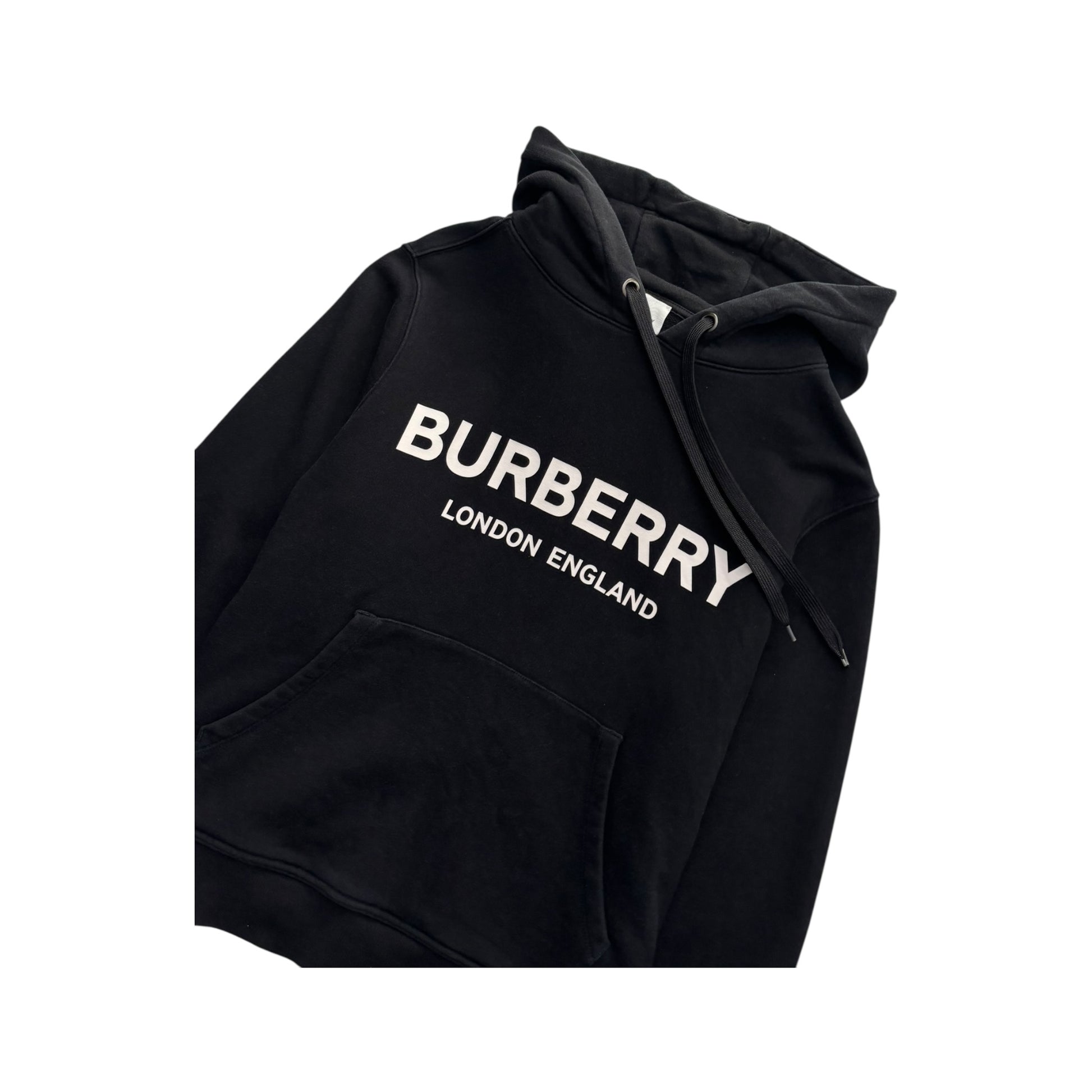 Burberry black hoodie featuring the classic Burberry London, England logo printed across the chest.