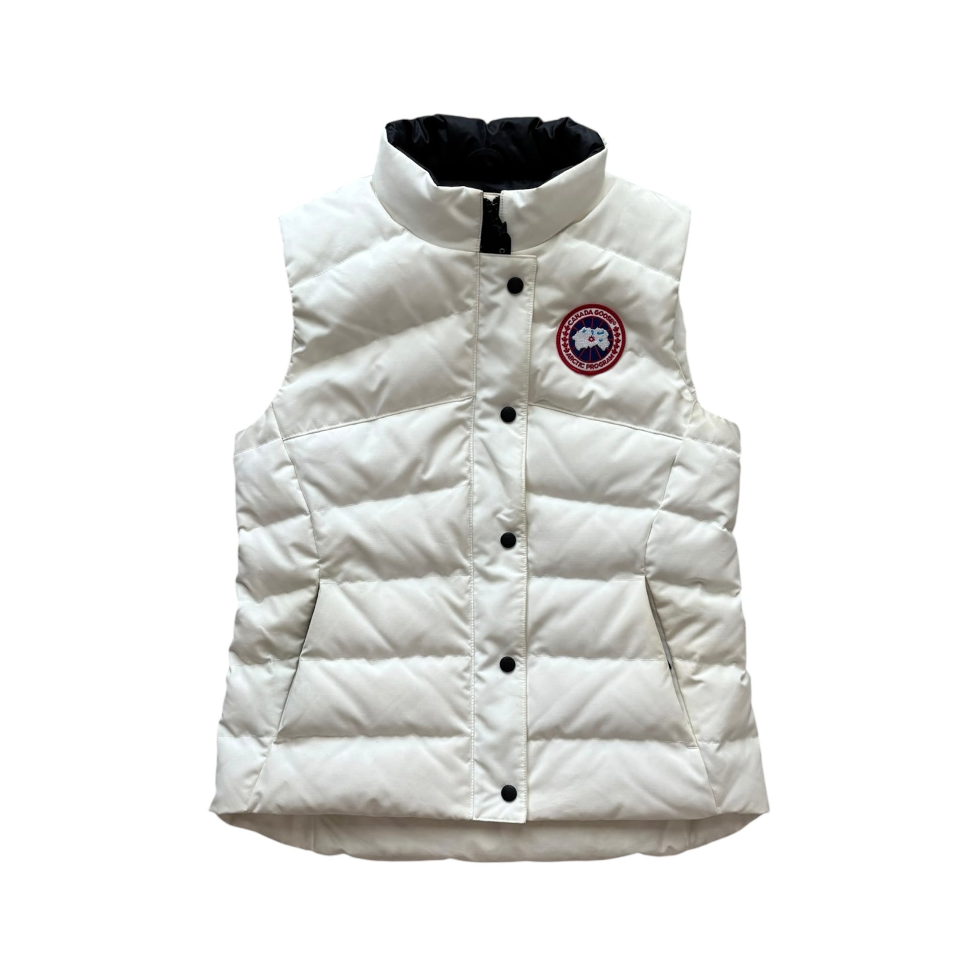 Classic white Canada Goose down vest featuring the signature Arctic Program patch on the chest.