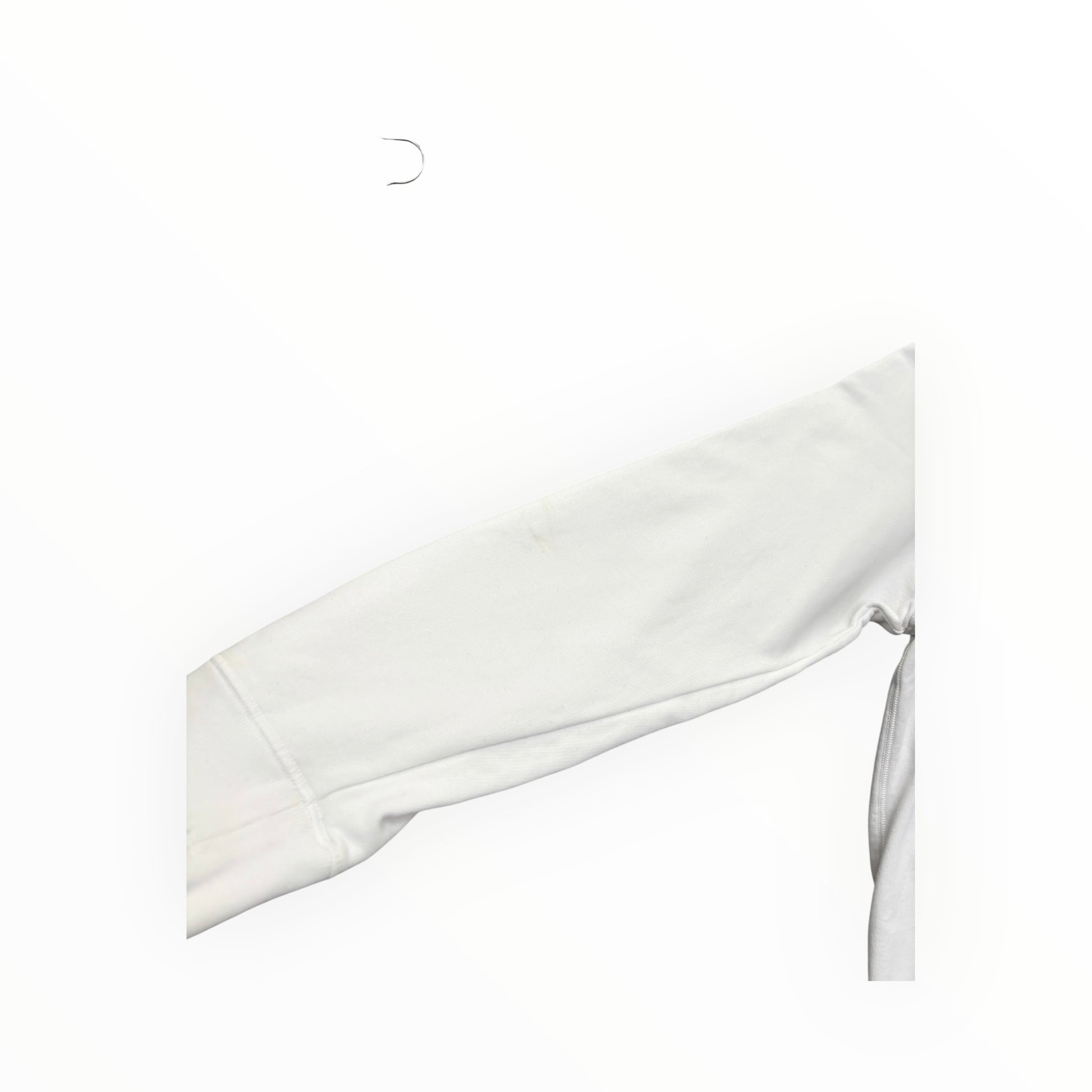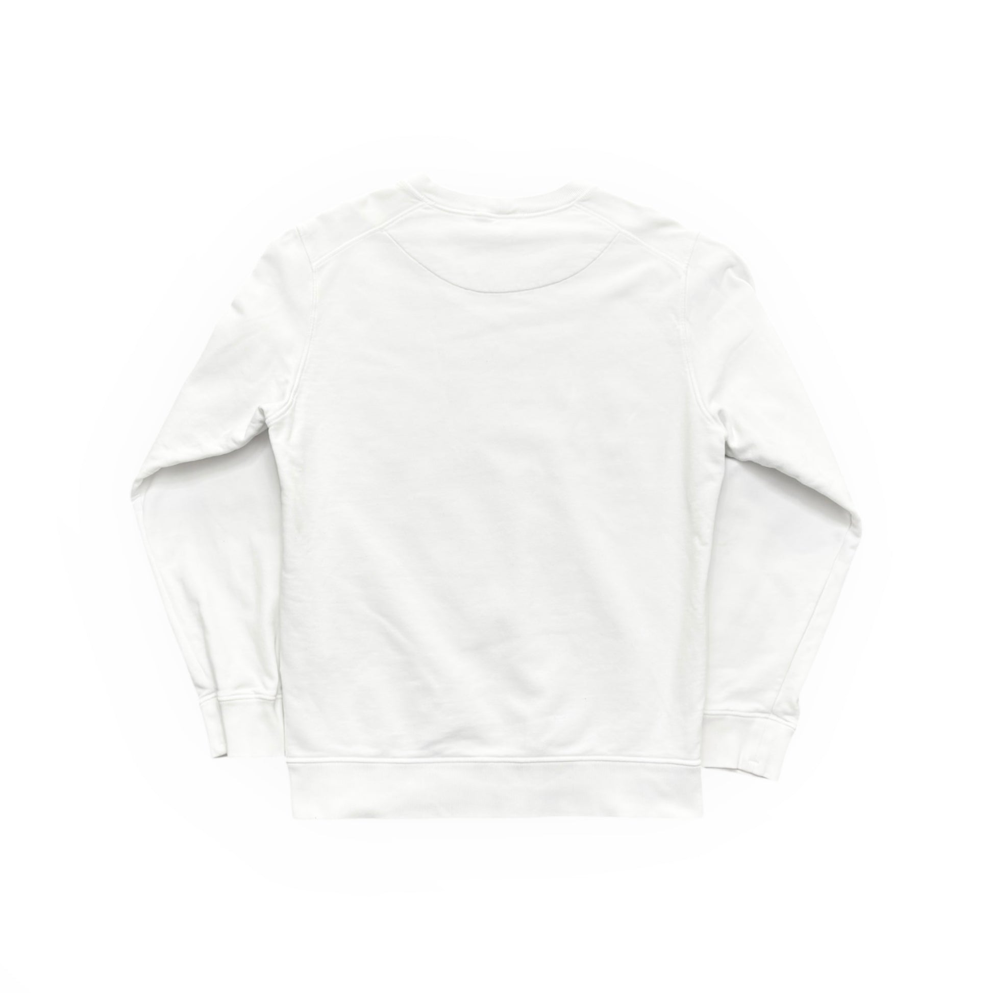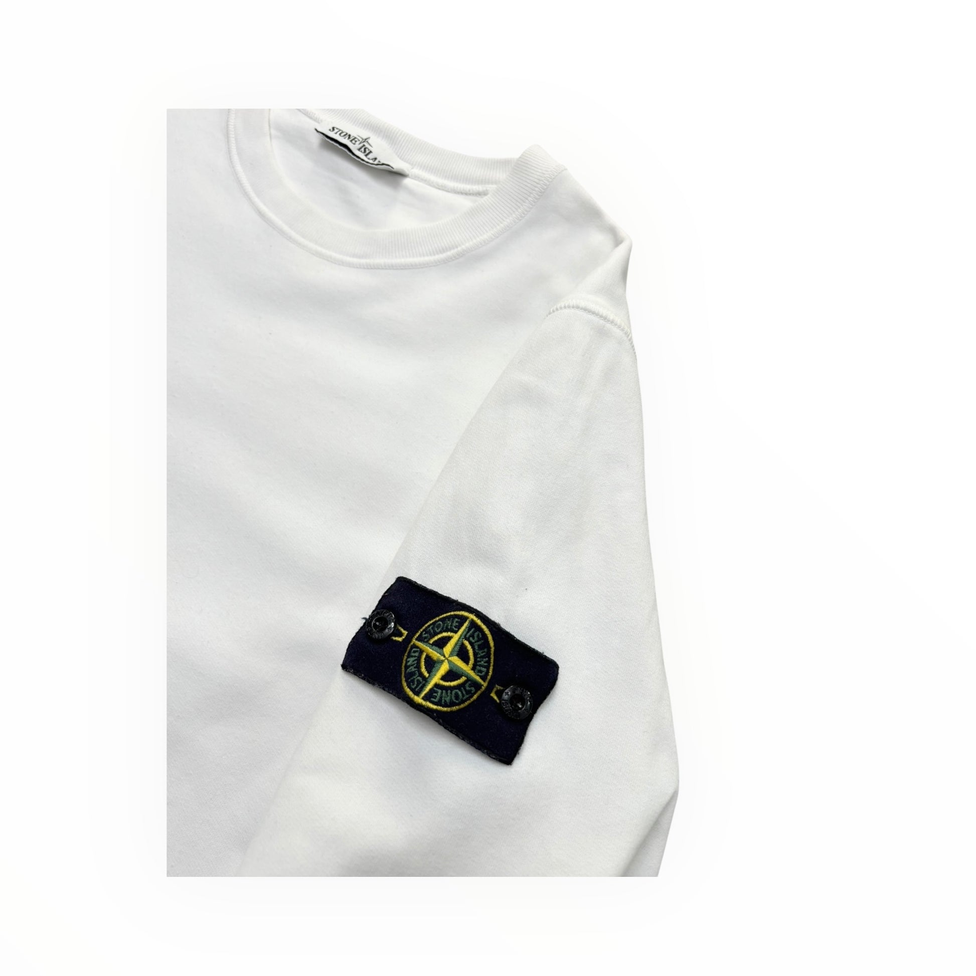 Stone Island white crewneck sweatshirt featuring the signature detachable compass badge on the sleeve. Crafted from premium cotton with a clean minimalist design, ribbed collar, cuffs, and hem for a structured and comfortable fit.